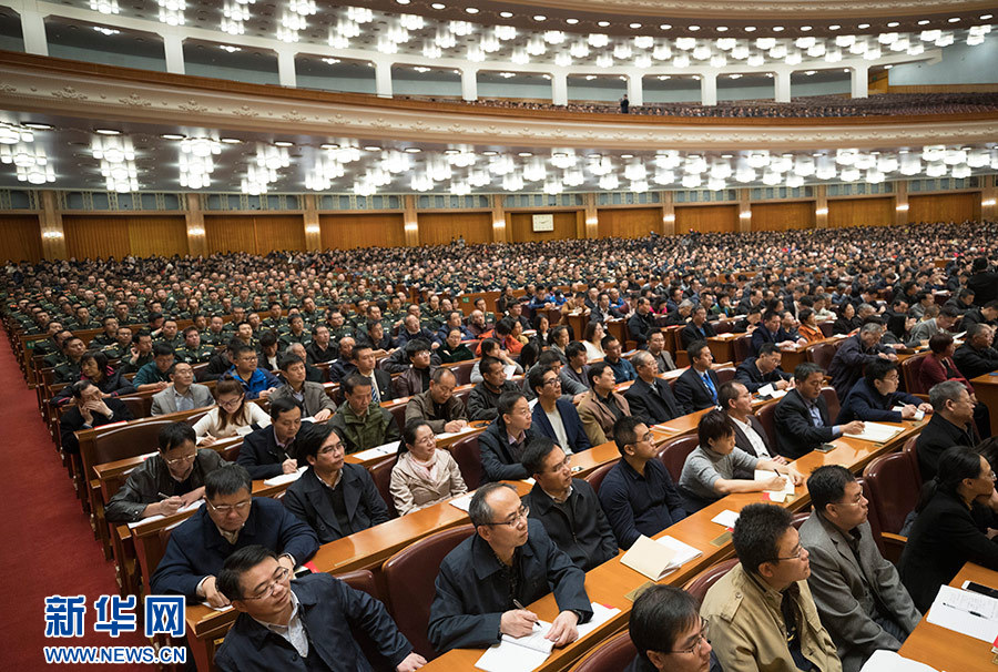 中央宣傳部、中央直屬機關工委、中央國家機關工委、教育部、中央軍委政治工作部、中共北京市委在北京人民大會堂舉辦學習貫徹黨的十九大精神中央宣講團首場報告會(11月3日攝)。新華社記者丁海濤攝