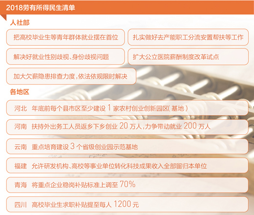 在全國層面,記者從人社部獲悉:2018年促進“勞有所得”主要有以下重點——