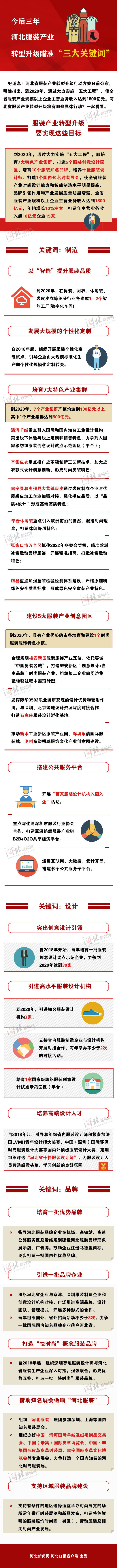 好消息!河北省服裝產業轉型升級行動方案日前公布,明確指出,到2020年,通過大力實施“五大工程”,使全省服裝產業規模以上企業主營業務收入達到1800億元。河北省服裝產業轉型升級將有哪些具體行動?一起看看。