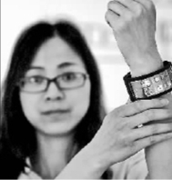 5月17日,具有完全自主知識產權的維信諾(固安)第六代全柔AMOLED(有源矩陣有機發光二極體面板)生產線,在河北固安啟動運行。圖為工作人員在展示一款柔性顯示智能可穿戴手機。新華社發
