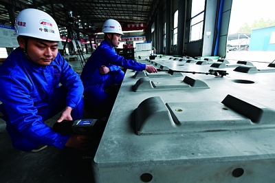 CRTSⅢ型先張法預應力混凝土軌道板是我國自主研發、具有完全自主知識產權的一項重大科技成果。圖為工作人員給CRTSⅢ型先張法軌道板進行激光打碼。新華社記者 宋振平攝