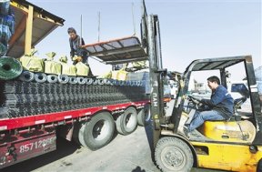 近日,工人在位于安平縣高新技術產業開發區的聚成國際物流產業園往貨車上裝載貨品。安平縣是全國大的絲網生產基地,總投資52億元的安平縣聚成國際物流產業園依托安平縣傳統絲網產業